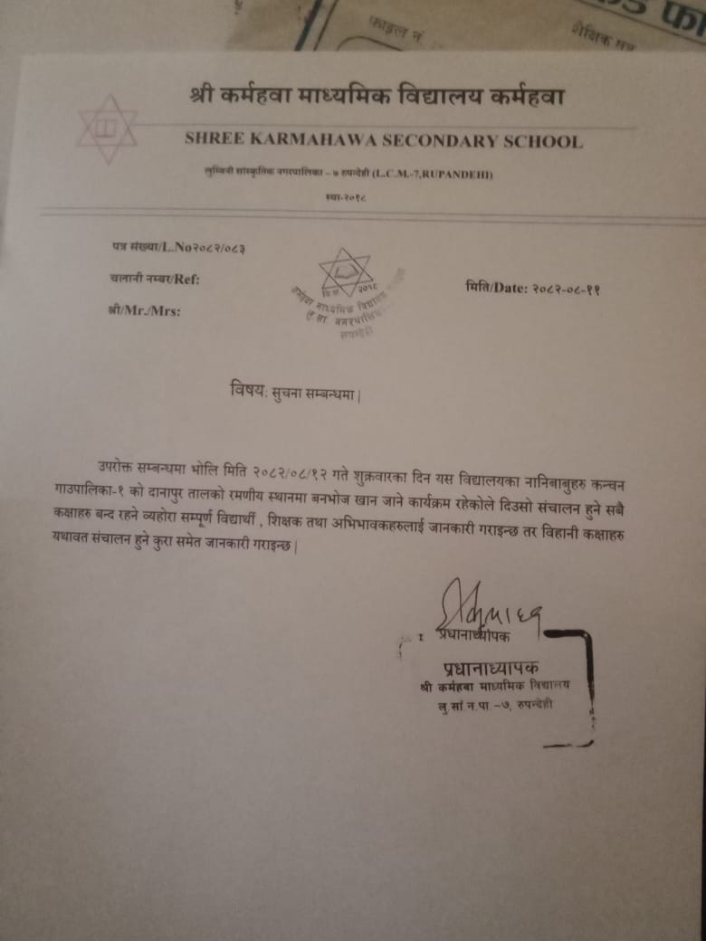 | १ | बनभोज कार्यक्रम तथा पठनपाठन बन्द रहने | 2025-11-27 10:05:04 | हेर्नुहोस् |
