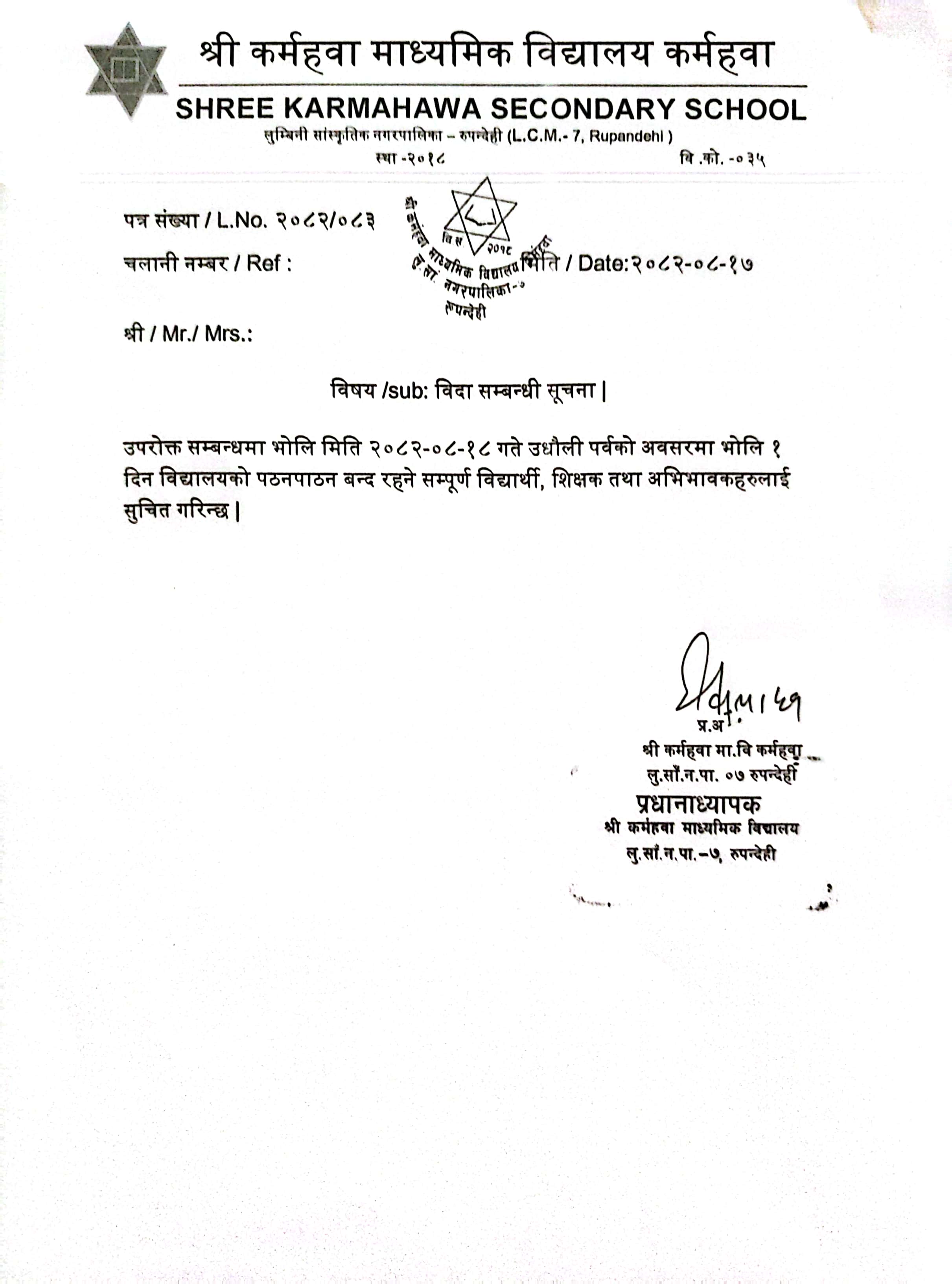 विदा सम्बन्धि सुचना कर्महावा विद्यालय 2025-12-03 14:09:43 |